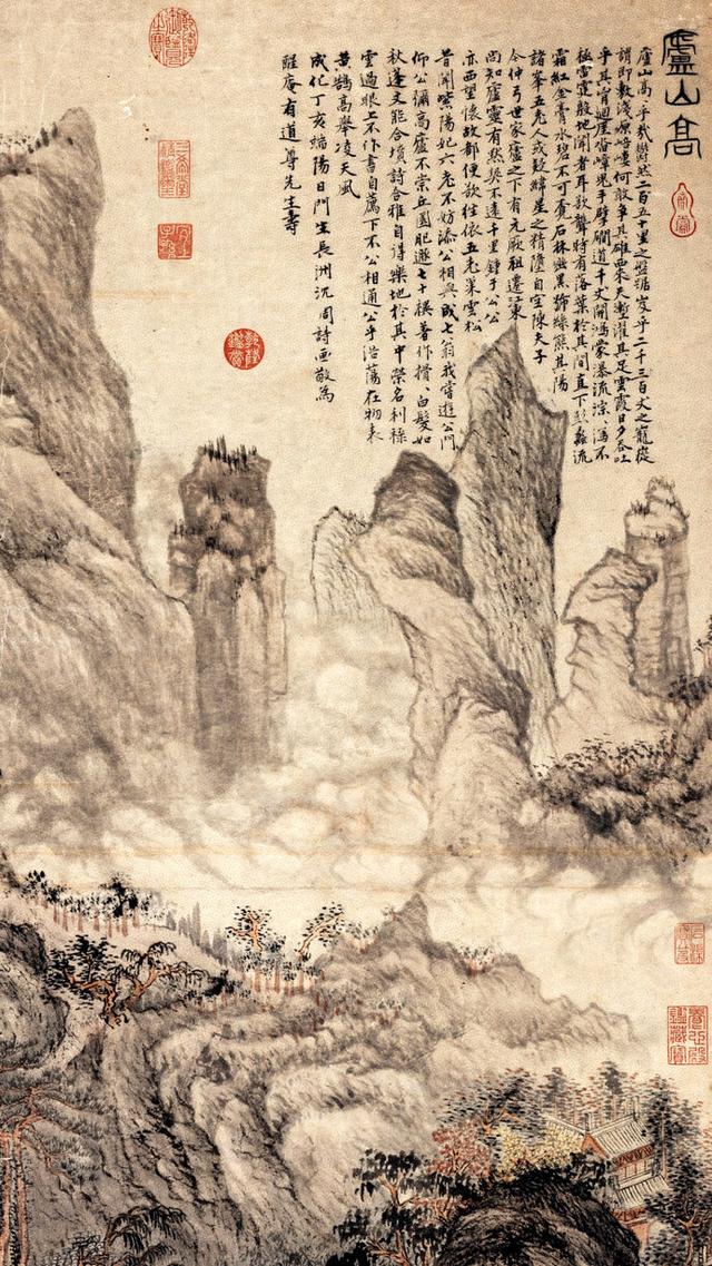 吴门画派的创始人沈周,代表作《庐山高图》,创作于41岁时,为祝贺老师陈宽70岁寿辰的精神,精心制作,也是最能代表沈中绘画风格的作品。此外吴门画派的代表画家还有董其昌、陈继儒、李日华等。 “吴派”自明代末期开始出现,后于清代被四王继承,成为中国绘画的主流,影响深远。