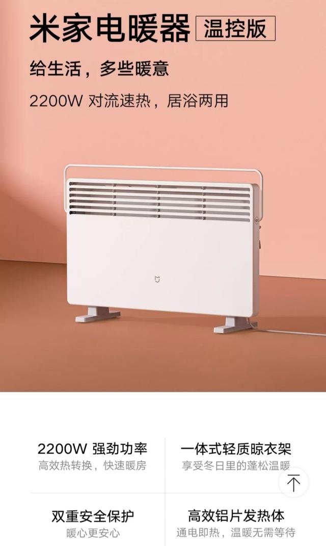 4, 第3个推荐的是米加电暖器,399元机身轻薄。2200瓦高功率,6个档位控制,还可以用小爱同学控制。