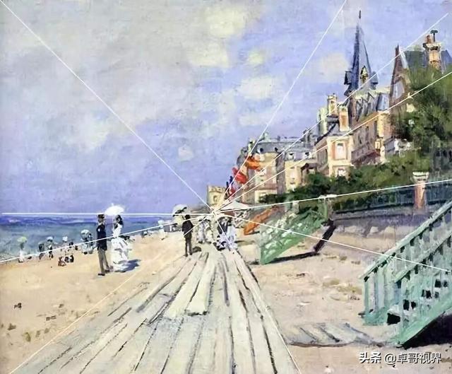 国画是散点透视,油画是单点透视,透视规则同样遵从近大远小。但是与西方绘画不同的是,西方绘画注重画面中的一个观察角度的空间纵深,通常只有一个消失点,而中国画中的空间纵深处理往往具有多个消失点,同时也自然具有多个观察角度。下左莫奈的这幅《海滩上的特鲁维尔》,画家放佛就站在原地,描绘眼前的静物;我们再看看中国绘画。来看下右这幅黄公望的《富春山居图》局部,虽然也有近大远小的特征,却不是严格按照光学原理研究出来的成像规律。