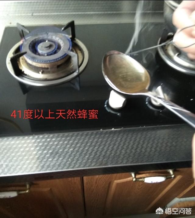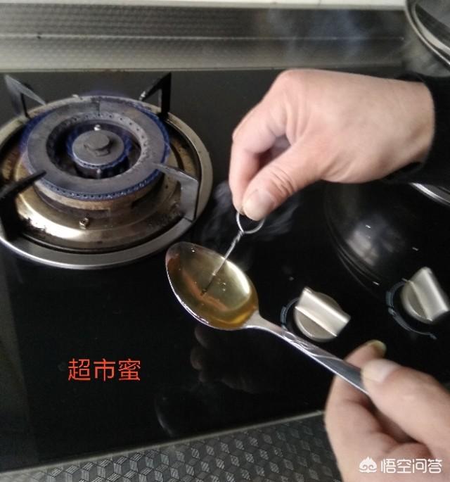 网传用烧红的铁丝粘蜂蜜来鉴别真假,冒烟而有杂物附着者为假,无烟无杂质附着者为真。看下图: