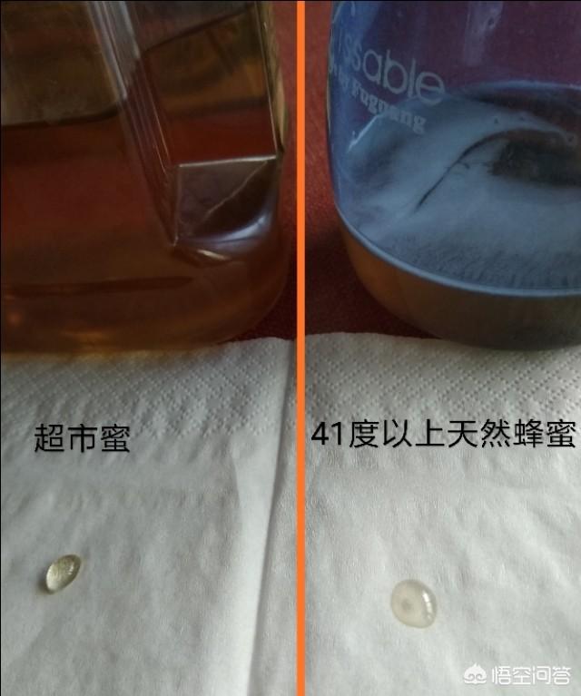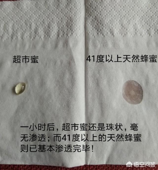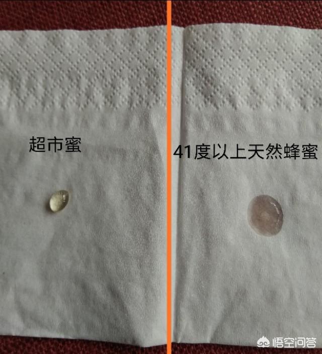 超市蜜与纯蜂蜜(41.8度),网传各滴一滴在纸巾上,观察是否渗透,不渗透者为真,渗透者为假。看下图: