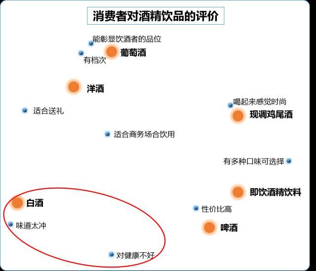 白酒口味方面,消费者在评价白酒时普遍认为相比其他酒而言,味道太冲。如下图所示,在消费者对酒精饮品的评价中,橙色标记代表酒精饮品,蓝色标记代表消费者评价,蓝色标记与橙色标记之间的直线距离代表两者的相关程度,距离越近越相关。消费者对各个品类酒饮品定位较为明确,和白酒接近的评价相对较为负面,如味道太冲和对健康不好。造成这种情况的原因,主要是由于白酒酒精度数相对太高所致。因此综合年轻消费者对酒精类饮品的诉求,白酒想要征服年轻一代的消费群体,需要深入的挖掘这部分消费者对于白酒产品真正的诉求。
