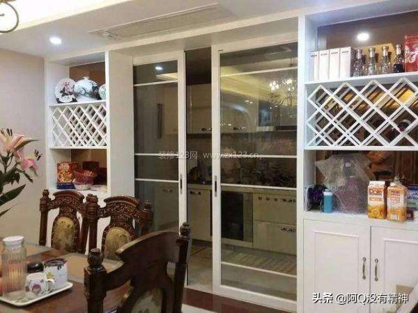 整体是一个柜中门的形式,视觉并没有明显的鞋柜和酒柜之分,只是左右使用功能不一样。这个规划利用了墙体空间,保证了客餐厅的整体格局不变,厨房门开启的状态下,通风最大化,动线也比较规整。建议柜子找人好好设计一下,多用灯光。