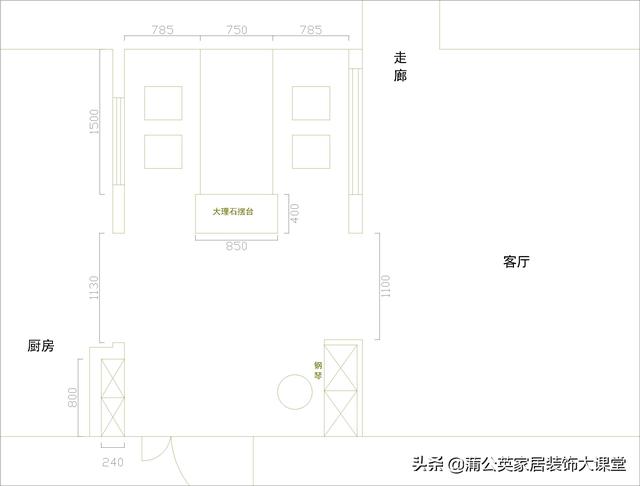 进门口正对餐桌前做一个大理石摆台,上面可以放一些装饰品摆件,让人进门后视线不空,后面再放餐桌,增加层次感。厨房隔断墙可以开一个窗户,增加透光性。如果居住人口多,摆台可以选择不要,这样空间变化多样,可以增加就餐人数。
