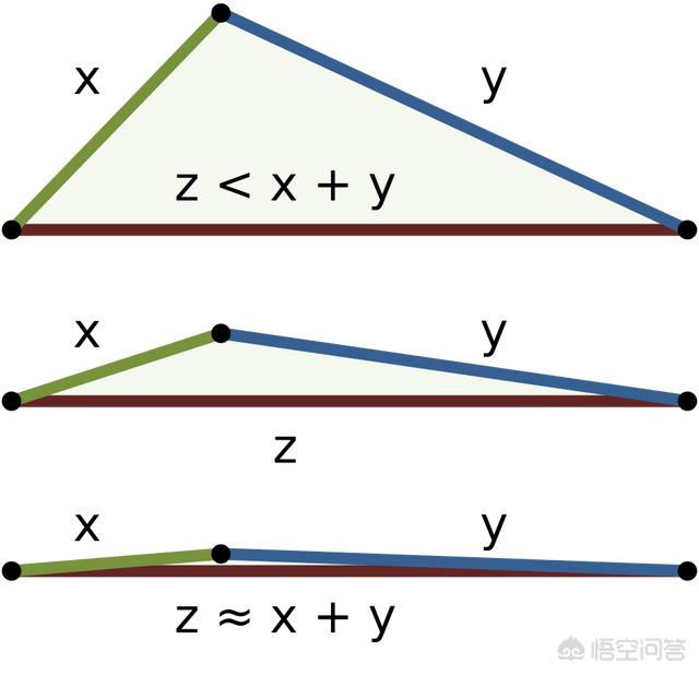 三角形任意两边可构成一条折线,折线的两端即为第三边。由于两点之间线段最短(如图),于是,我们有折线的长度>第三边的长度。即三角形的两边的长度之和>第三边的长度。