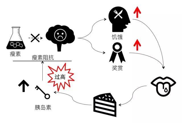 可是,如果胰岛素长期高居不下,它会阻碍大脑对瘦素的接收,导致“瘦素阻抗”。下丘脑感应不到足够的瘦素,以为身体处于饥饿状态,会想方设法让身体的其它部位保存能量,结果是这个人食欲大增,却没有精力运动。