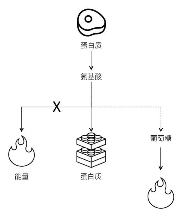 氨基酸重新组合后,形成新的蛋白质,但它不能直接提供能量。只有在身体能量储备非常低的时候(例如饥荒)或者在紧急情况下(例如被老虎追),氨基酸才会被转化成葡萄糖,间接地提供能量。