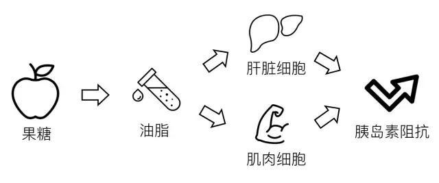 和乙醇一样,大部分的果糖在肝脏里转成油脂,造成肝脏细胞和肌肉细胞油脂的囤积,引起胰岛素阻抗和非酒精性脂肪肝。