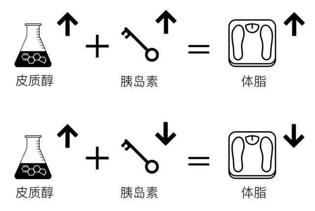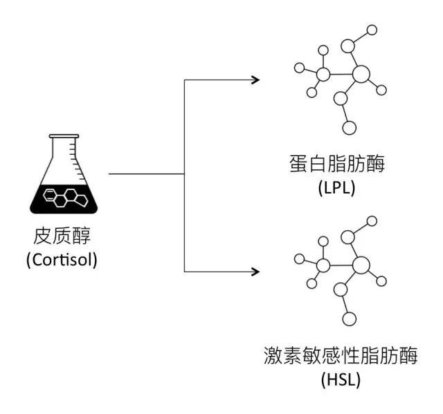 皮质醇有刺激脂蛋白脂肪酶(LPL)和激素敏感性脂肪酶(HSL)的作用。LPL的作用是将脂蛋白带入脂肪细胞或者肌肉细胞。HSL的作用是释放储存在脂肪细胞里的脂肪。换句话说,LPL帮助增脂,HSL帮助减脂。