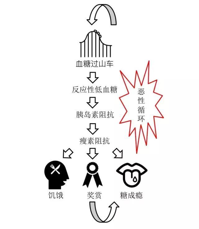 胰岛素阻抗会导致瘦素阻抗。出现瘦素阻抗时,大脑以为身体处于饥饿当中,会形成一种持续的不快乐。恰好血清素带来的幸福感可以暂时取代这种不快乐。“在不快乐中寻找快乐”,这时候人会寻求更多的糖和碳水化合物,糖瘾就是这样形成的。