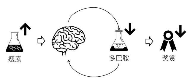 在正常情况下,食物吃够了之后,瘦素会向大脑发送信号,抑制多巴胺的释放,从而减少食物带来的奖赏。