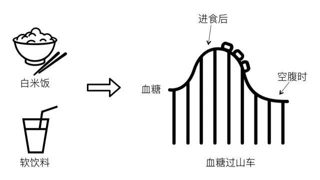 可是,一碗白米饭却不一样。因为米饭里大部分是淀粉,淀粉消化后就是葡萄糖,因此一碗白米饭可以使饭后的血糖冲得很高,形成「血糖过山车」。