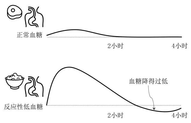 还是以五花肉和白米饭做例子。如果你光吃一碗白米饭,过量的胰岛素分泌可能导致餐后血糖降得太快太低,出现“反应性低血糖”。