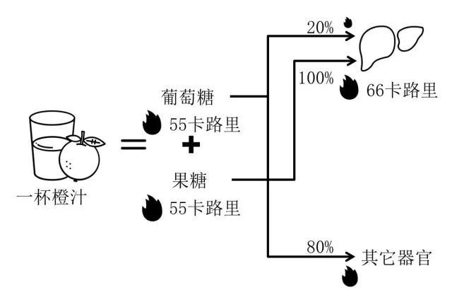一杯橙汁含有55卡路里的葡萄糖和55卡路里的果糖。55卡路里的葡萄糖中,20%(11卡路里)会在肝脏里代谢。55卡路里的果糖中,几乎100%会在肝脏里代谢。也就是说,总共66卡路里的橙汁会在肝脏代谢。