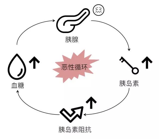 一旦胰岛素阻抗形成了,胰腺需要分泌更多的胰岛素才能把血糖降下来,而更多的胰岛素会进一步降低细胞的胰岛素敏感性,令胰岛素阻抗更加严重。