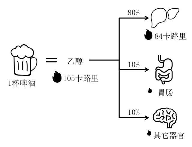 当你喝了一杯啤酒后,80%的乙醇,也就是84卡路里在肝脏里代谢。