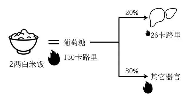 当你吃了2两米饭后,它会转成130卡路里的葡萄糖,其中只有20%,也就是26卡路里由肝脏进行代谢。