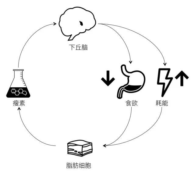 瘦素(Leptin),被称为“饱腹感激素”,是脂肪细胞产生的。瘦素通过血液循环,到达大脑的下丘脑(Hypothalamus),告诉它贮存在脂肪里的能量已经足够了。在瘦素的调节下,食欲会得到控制,人会感觉精力充沛,有幸福感。