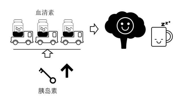 血清素(serotonin)是使人感到幸福和快乐的神经传导素。当你吃较多的碳水化合物,特别是糖的时候,胰岛素会促进血清素在大脑里的合成,让人感到幸福和昏昏欲睡。