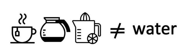 要注意的是,茶、咖啡、果汁、碳酸饮料都不是水,它们是利尿剂。利尿剂导致排出的水比喝进去的还多。如果从早到晚喝的都是这些饮料,你其实没有喝到水。