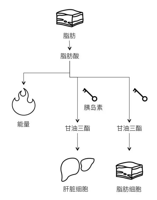 当人体需要能量的时候,脂肪酸会被进一步分解,提供能量。多余的脂肪酸在胰岛素的作用下,被合成甘油三酯,储存在肝脏细胞和脂肪细胞里,也就是我们常说的身上的脂肪。