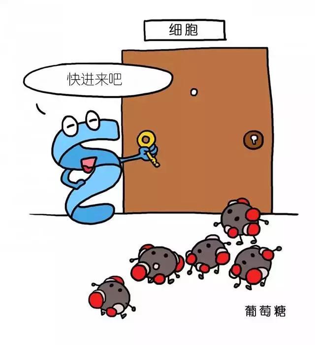 葡萄糖被细胞吸收后,血液的葡萄糖浓度就会降低。因此胰岛素的任务除了储存能量,还有降低血糖。