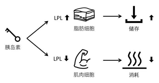 胰岛素会激活脂肪细胞的LPL,特别是腹部的脂肪细胞。同时胰岛素会抑制肌肉细胞的LPL。因此胰岛素释放得越多,脂肪被存储得越多,消耗得越少。