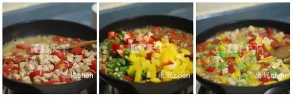 10、在烤盘上放上米饭11、 在米饭上面放入刚刚煮好的蔬菜和鸡丁,连着汤汁一起浇在米饭上