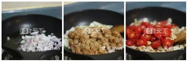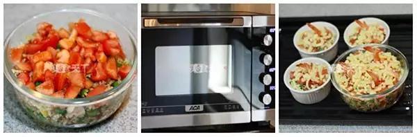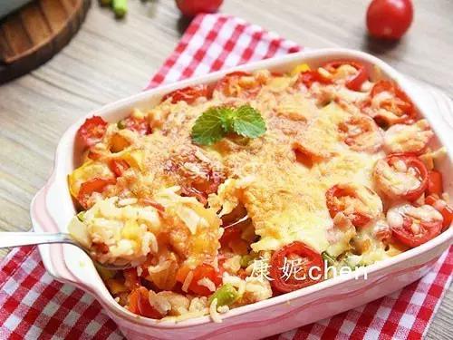 7、炒好的饭饭放在烤碗里,上面铺上切好的西红柿。8、入预热好的烤箱,先烤5分钟。