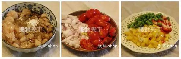 4、你也可以象我一样留一部分虾尾做装饰。5、配菜切成粒。