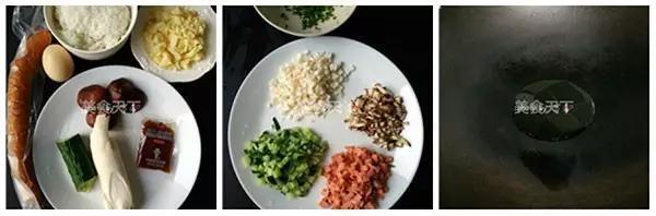 1、备好食材:剩米饭,香菇,黄瓜,杏鲍菇,鸡蛋,马苏里拉芝士,蒜香烤肠;2、分别将杏鲍菇、香菇、烤肠、黄瓜切丁;小葱切葱花;