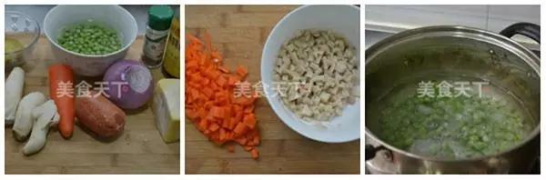 马苏里拉奶酪适量、米饭1碗、小胡萝卜1根、蘑菇3朵、洋葱1/4个、橄榄油适量、盐适量、黑胡椒粉适量