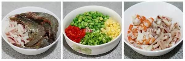 1、将虾和鱿鱼圈洗净。2、准备好配菜,毛豆米和碗豆米焯一下水。
