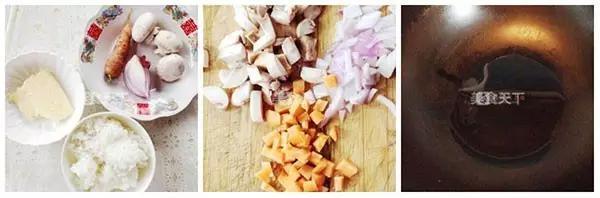 剩米饭两碗约400g、火腿150g、青豆100g、胡萝卜半根、洋葱半个、杏鲍菇200g、马苏里拉奶酪150g、咖喱块2块、黑胡椒碎适量、蚝油两大勺、盐和鸡精适量