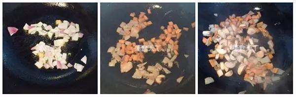 4、倒入洋葱,炒香。5、加入胡萝卜,一起翻炒一下。