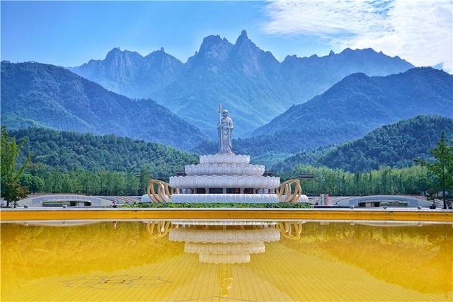 地藏菩萨露天铜像气势恢弘,端然肃立于九华山的巍巍群峰之间,高达九十九米,与九华山九十九座山峰、金地藏享年九十九岁的寓意相一致。铜像是世界上最高的露天大佛铜像。