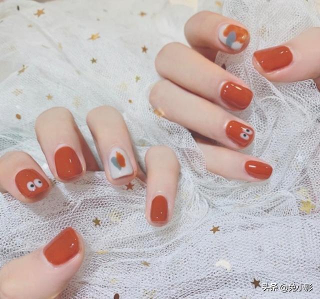 可以用活力橙色涂满甲面、黑白色、雾蓝色涂小面积作为点缀色,可以增添不少亮点,适当挑无名指或者食指作为重点刻画图形,就十分出彩了,这样的款不仅看似丰富,而且也很简约,透着满满的青春活力,十分元气!