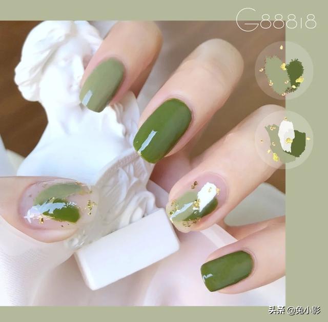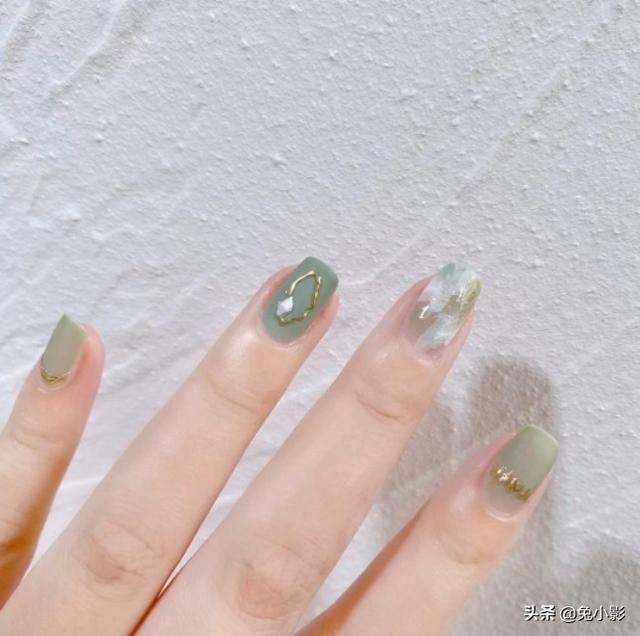 磨砂哑光雾面质地高级,质感满满;亮面是水当当的感觉,温柔清新!用绿色、白色做拼色美甲,金箔纸或者金属装饰点缀,很是高级!