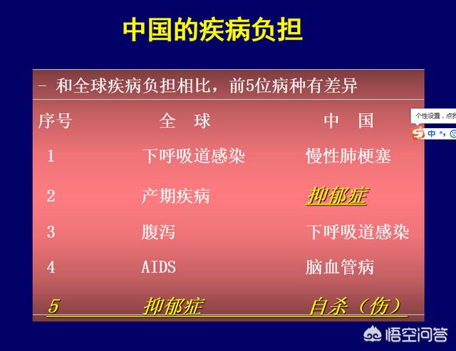 在我国疾病负担的排名中,前五名中有两项和精神疾病有关,可以想象精神疾病在如今的中国已经是不能忽视的问题了。