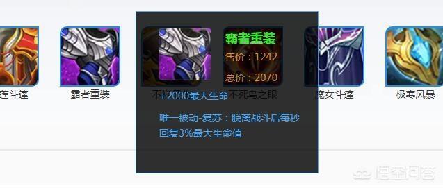 游戏后期出装:游戏后期对面AD的破甲装备基本已经成型,作为坦克想要提高抗伤害能力,还需要做的装备就是肉装:不死鸟之眼和霸者重装都是很不错的肉装。