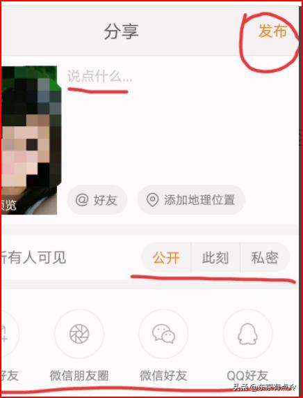 8、这时我们可以输入自己的一下感想,设置哪些人可见,分享到哪些圈和空间里等等,这些都可以自己设置,最后点击发布就大功告成了。