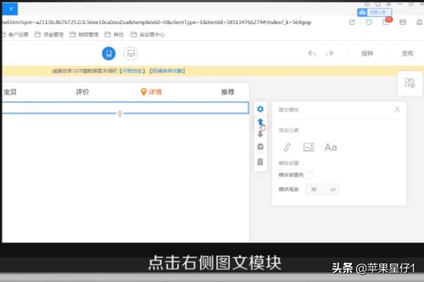 2、点击“详情装修”,选择一个宝贝进行装修,点击“图文模块”添加图片。