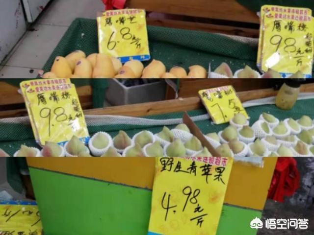 以上图中的三种水果,价格都不贵。而在上个月,那个鹰嘴桃、和芒可都是在10元以上的,图上苹果虽然是青的,但也有红的,还是进口的也才卖6元左右。