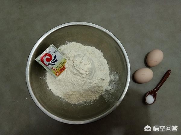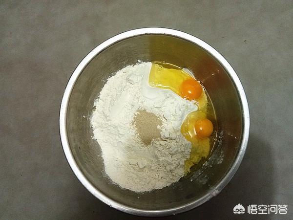 鸡蛋打入面粉中,加入酵母粉、食盐。