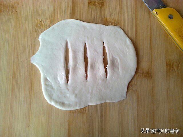 取一份小面团擀成面皮,用刀在面皮上划三刀。