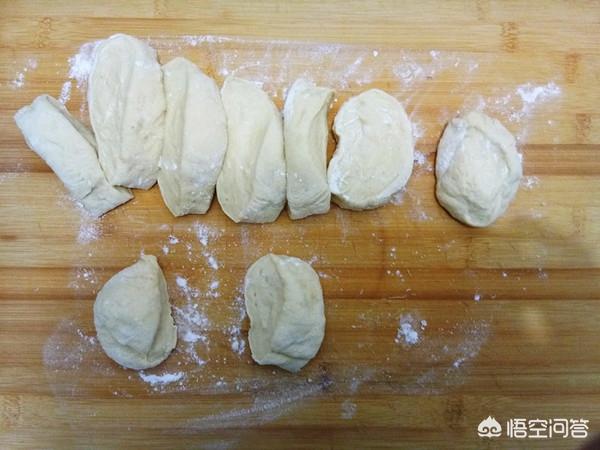 3,用手揪出一小团面,《发酵好的面》,揪出同等大小的挤子,擀圆面皮