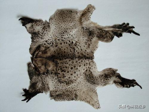 蟾赊背上的水分干了以后,用细眼喷壶喷少峡脱衣素在蟾蜍背上。通常用药以后 4天会开始脱皮, 10 天内全部脱完.蟾蜍脱衣的时候会从背上开始,然后是头、后腿、腹部和前腿。刚脱下的蟾衣有粘液,用镊子夹住蟾衣在清水里轻轻漂洗干净。然后用不锈钢镊,把蟾衣放在 预先准备好的 25 厘米长和12 厘米宽的玻璃板上轻轻拉开制成标本的模样。拉标本的时候用力要轻,不要拉破或者拉不开。标本制好以后,放到室内晾干或者放入红外线消毒柜里烘干。通常有九成干就算是成品了。如果觉得使用蟾蜍脱衣素对蟾衣的药用价值有影响,也可直接剥掉蟾衣,但要在冰箱里把蟾蜍冻死以后再取。