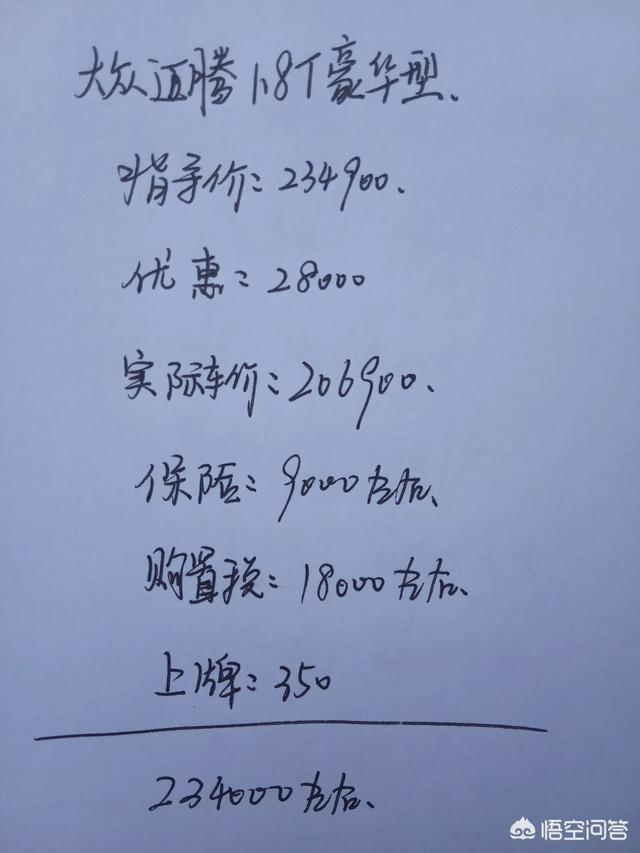 大众迈腾1.8t豪华版车型的指导价234900元,目前这款车的市场终端优惠还是比较大的,笔者通过走访我们当地的4s店了解到,目前这款车的市场终端优惠大概在28000元左右,也就是说实际车价206900元,从上图大家可以看到,其中保险9000元左右,购置税18000元左右,上牌费350元,全款落地的费用大概在234000元左右,这样的价格对于消费者来说吸引力确实比较大。