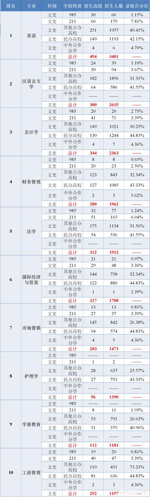 不过好在很多热门专业的招生数量还是十分庞大的,也能让考生在选择时,有所参考。毕竟无论如何都有1/4左右的人落入这些专业中,甚至文史类达到了41%。为此将2018年的招生人数及2017年最终录取结果整理给大家。