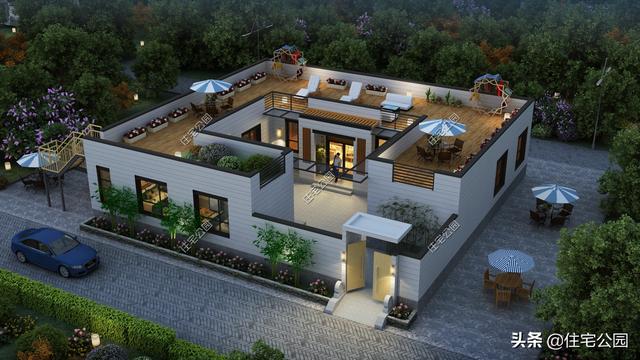 流线型的外观表现,很符合现代建筑的特征。同时细节处的中式元素点缀,简约素雅不露风头,恰到好处。独特的上人屋顶,活动区域又增加一块。这样的一层小院你喜欢吗?